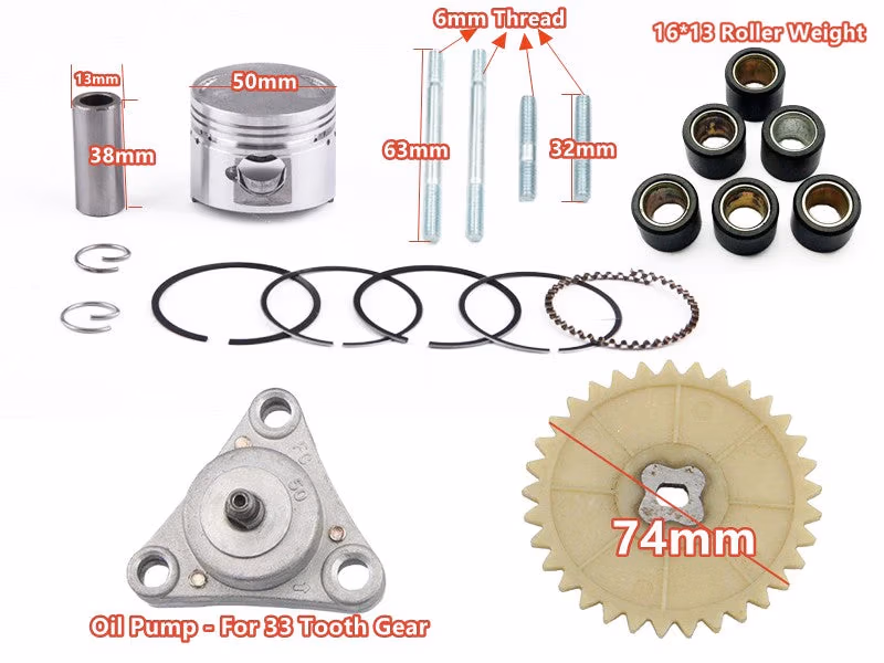 This kit includes : 50mm Cylinder Bore Kit Non-EGR style with 64mm Valve installed Piston sets–50mm Cylinder Body Cylinder head–No ERG with 64mm Valve Roller weights Oil Pump Oil Sproket Whole set of Gaskets for short case of QMB139 engine. – Kits sold separately price: $39.99 Carburetor Assembly GY6 50cc engines Inner Diameter:19mm Outer Diameter:40mm Electric Chock:2pin, male plug) – sold separately price:$18.99 Intake Manifold Engine Mouth Side Inner Diameter:18.5mm Carb Mount Side Inner Diameter:27mm Bolt Hole Spacing:45mm)- sold separately price:$3.99 Insulator intake manifold Gasket GY6 50cc Center Hole Diameter:16mm Bolt Hole Spacing:45mm -sold separately price:$2.99 38mm Performance Air Filter Intake Inner Diameter:38mm -sold separately price:$4.99 GY6 50cc Complete Variator Kit Number of Teeth:62 Number of Splines:26 Outer Diameter:87mm Roller Weight:8.5g -sold separately price:$11.99 GY6 50cc Ignition Coil Overall Length:19 inches Wire Length:14 inches -sold separately price:$5.99 A/C Gy6 Performance CDI Split Plug:2 pin/4pin Dimension:38mm*74mm*30mm AC-Alternating Current) -sold separately price:$5.99 Vacuum Actuated Fuel Valve Pet Cock 4 Ports Bolt Hole Diameter:7mm -sold separately price:$4.99 Fuel Filter Universal in-Line Fuel Filter for Scooters -sold separately price:$0.99 Rocker Arm Set GY6 50cc Length:50mm Match for 64mm Valve -sold separately price:$4.49 Muffler exhaust Kit with Pipe. Fit for most of QMB139 Engine. Length:510mm Diameter:100mm -sold separately price:$52.99 Kit comes with 1more set of roller weight for backup. Each set is with 6 pcs roller weights.